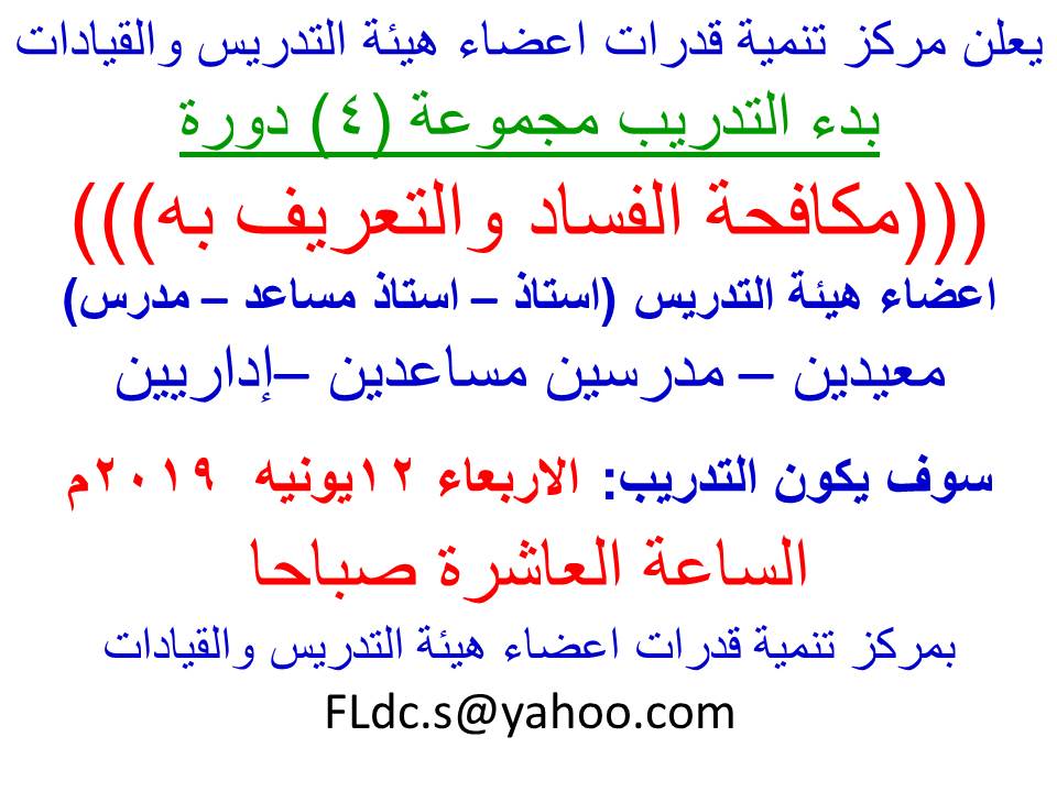 بدء التدريب بدورة ((مكافحة الفساد والتعريف به)) يوم الاربعاء 12 يونيه 2019م من العاشرة صباحاًبواسطة portal326 مايو، 201926 مايو، 2019